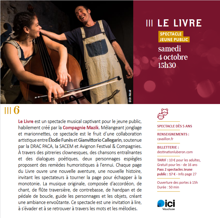 Le Livre sera joué le 4 octobre 2025 au Moulin Saint-Julien à Cavaillon, achetez vos places en ligne et venez nombreux !